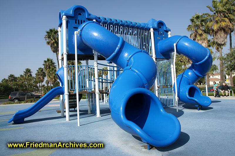 An example of modern playground equipment. The ground is a soft rubber (instead of asphalt); there are no swings, and the tubes are large enough to support an accompanying adult.