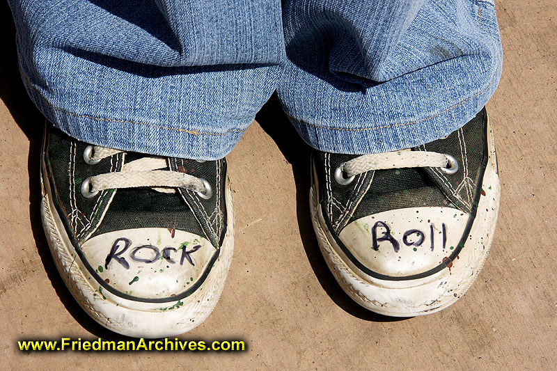 Shoes belonging to a teenager with the words “Rock” and “Roll” written upon them.