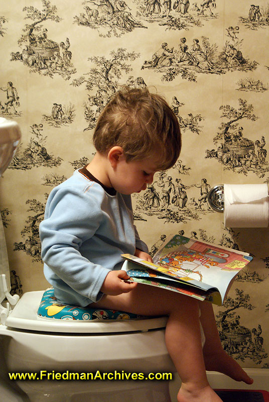 A toddler spends some quality reading time on the toilet.