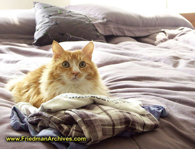 A cute cat sits on a pile of laundry as if it was her own bed. "Who, me?"