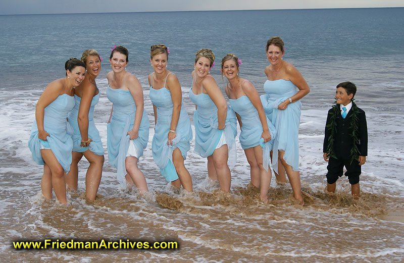 This group of bridesmaids literally get their feet wet at an seaside wedding in Maui, Hawaii.