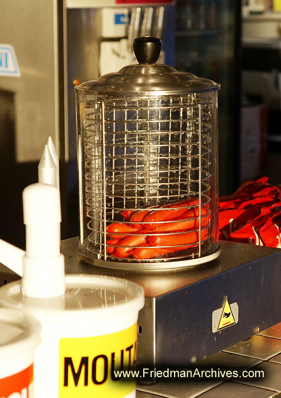Hot Dogs Hot Dogs Red Hot Dogs on a fast-food counter. “(C) Gary L. Friedman. This image is available for licensing. Contact info@FriedmanArchives.com”