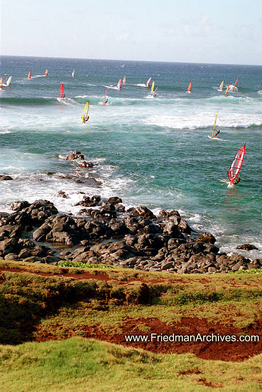 Windsurfers Windsurfers Windsurfers come from the world over to a beach in Paia, Maui, known also to surfers for its awesome year-round waves. “(C) Gary L. Friedman. This image is available for licensing. Contact info@FriedmanArchives.com“